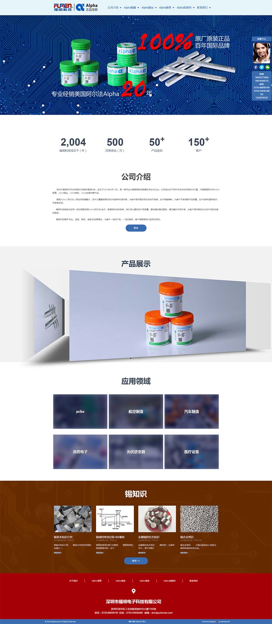 深圳市福明電子科技有限公司簡稱福明科技,成立于2004年4月16日,是一家專業從事焊錫制品銷售的專業化企業。公司地址位于深圳市龍華區龍勝時代大廈,代理美國阿爾法Alpha錫膏、Alpha錫絲、Alpha錫條、Alpha助焊劑等產品。